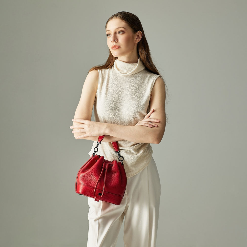 Wrapped in a rich festive red, the Gab bucket bag brings a polished, celebratory touch to any occasion. Crafted from soft Nappa genuine leather with matte-black hardware, it features thoughtful compartments and interchangeable straps for effortless style and functionality—perfect for the holidays and beyond.