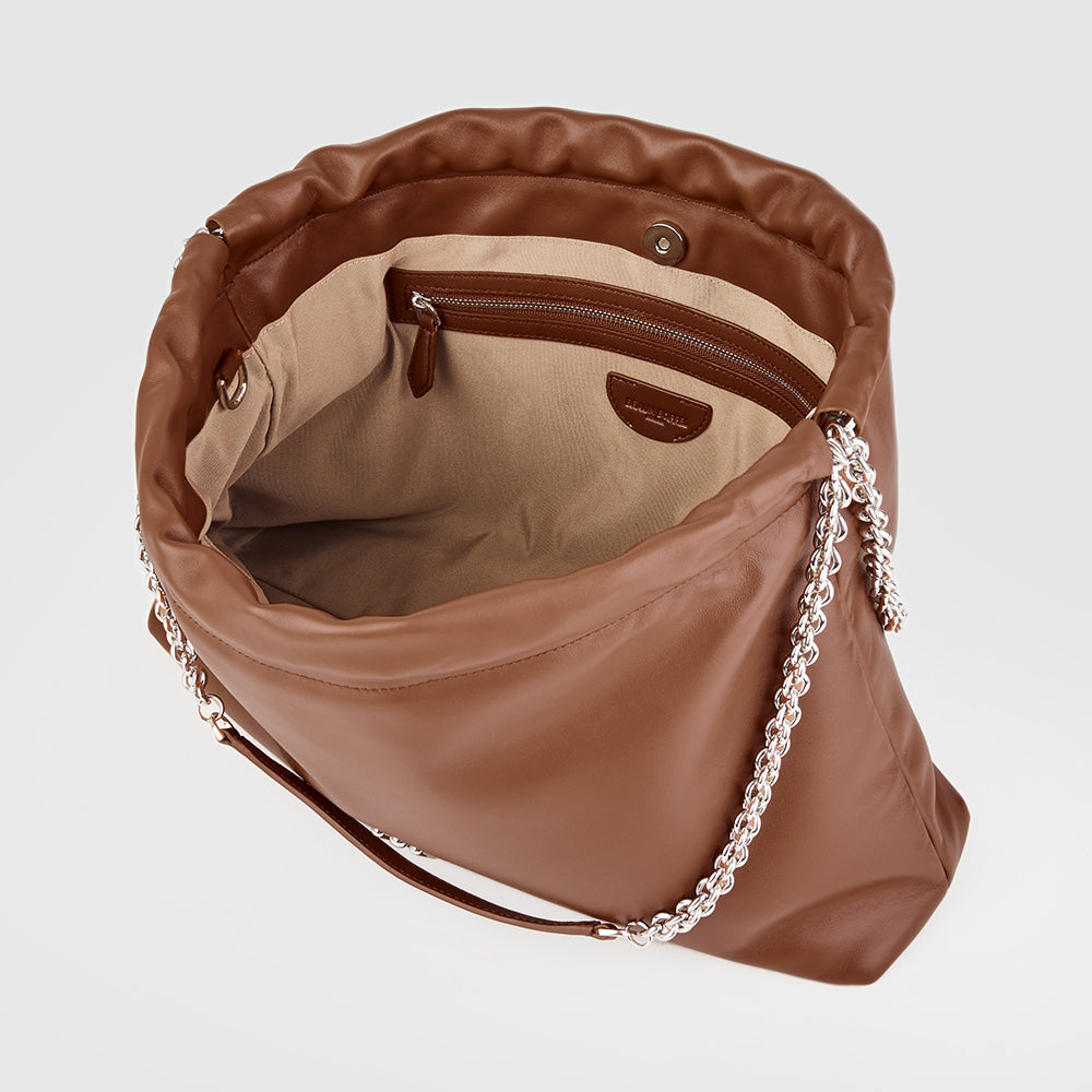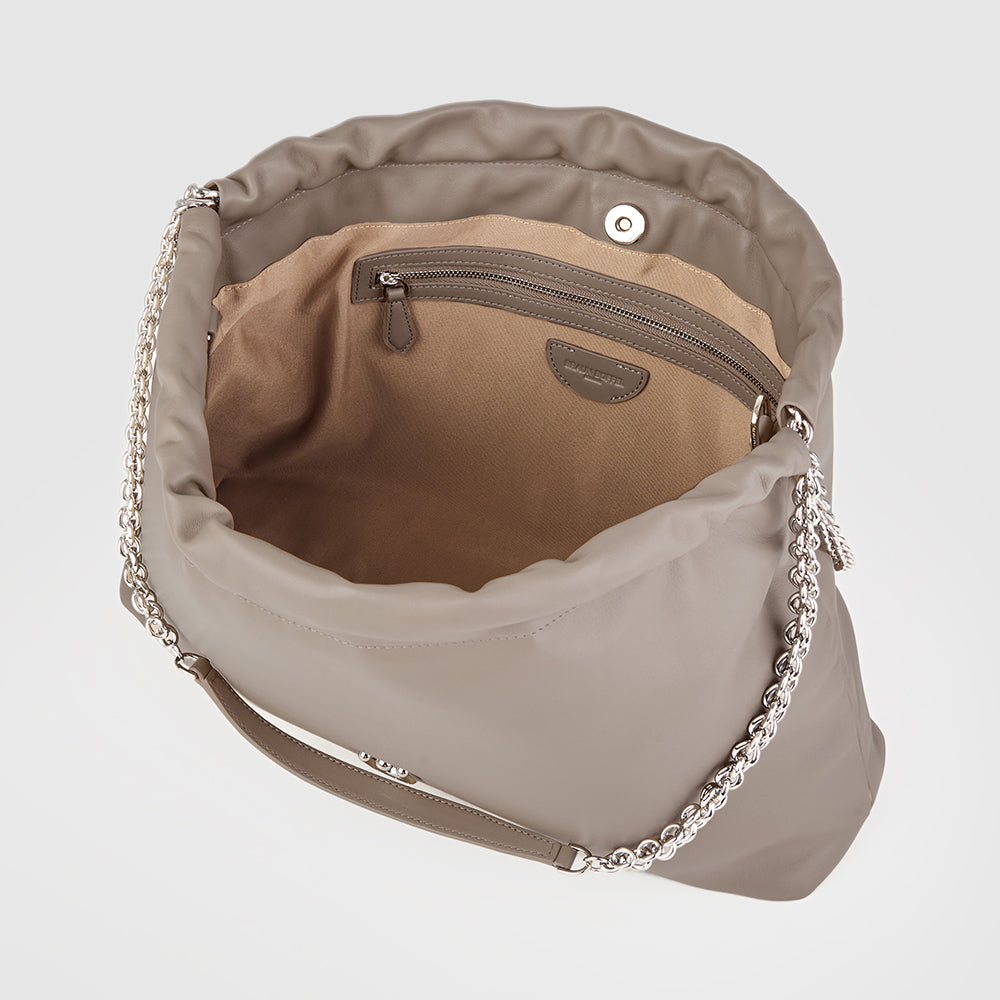Ayla is where plush meets elevated ease. Crafted in luxurious lambskin and accented with shiny nickel hardware, the collection offers a minimalistic yet elevated interpretation of the classic hobo silhouette. Available in a medium and large size, Ayla is thoughtfully designed to suit both everyday carry and elevated occasions—spacious, comfortable, and effortlessly stylish from morning to night.